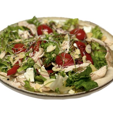 куряче філе, фета, баклажан, помідори чері, лист салату, горіх грецький, перець болгарський печений, горіховий соус