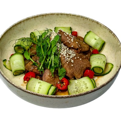 язик яловичий, соєвий соус, часник, огірок