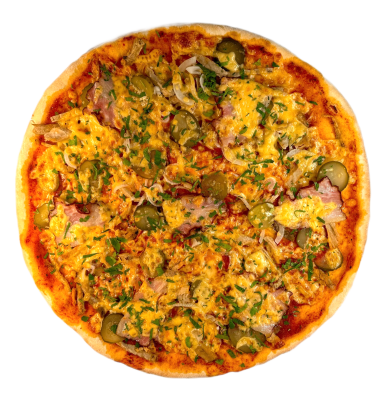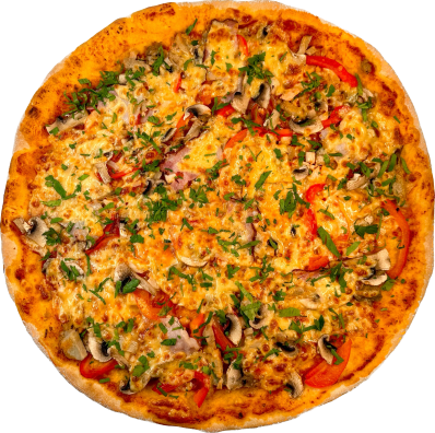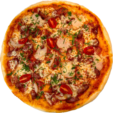 соус томатний, бекон, філе куряче, свинина пікантна, сир твердий, гриби шампіньйони, перець болгарський, цибуля маринована, зелень