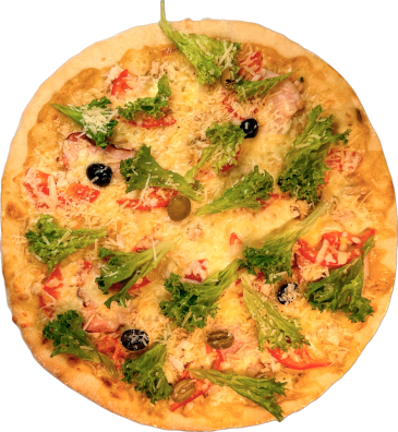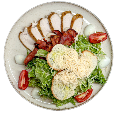 соус цезар, філе куряче, бекон копчений, сир моцарела, сир пармезан,мікс салату, помідори свіжі, маслини, оливки