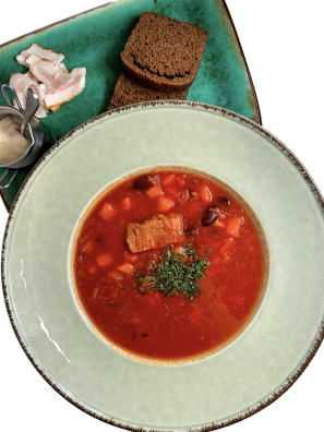 подається з сметаною, зіньковецькою ковбасою та грінками
