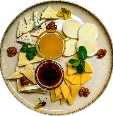 брі, моцарела, чері, дорблю, пармезан, мед, карамелізовані горіхи, малиновий соус