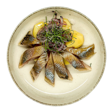 оселедець, картопля, маринована цибулька