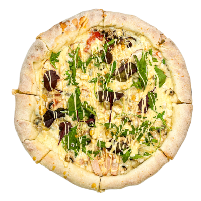 соус бешамель, курочка печена, курочка копчена, кукурудза, гриби, мікс салату, соус чедер, моцарела, помідор