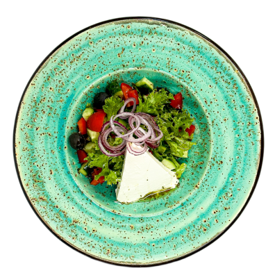 мікс салату, помідори, огірки, перець болгарський, фета, маслини, цибуля маринована, соус грецький